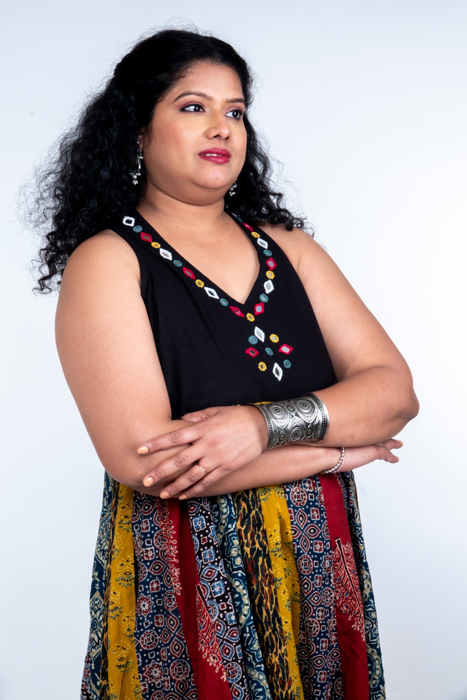 Breathe in the joy of celebration with the Navrang Dress from our Khelaiya Edit. It is a sleeveless one-piece crafted in breathable cotton, brought alive with multicolour Ajarakh patchwork and sparkling hand-stitched mirror work. With its diamond neckline and a 4-metre flare, this festive favourite flows beautifully while keeping you rooted in tradition. A modern celebration companion, designed for comfort, grace, and every twirl-worthy moment.