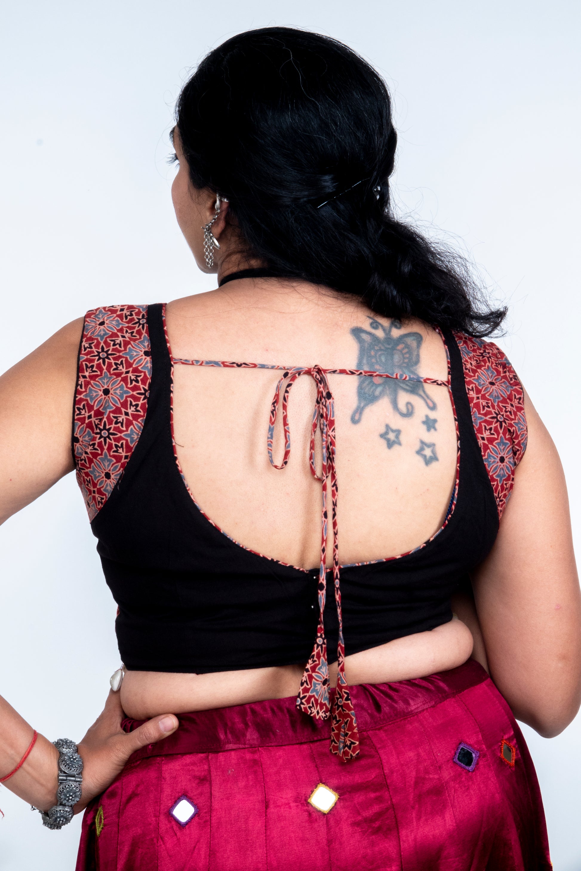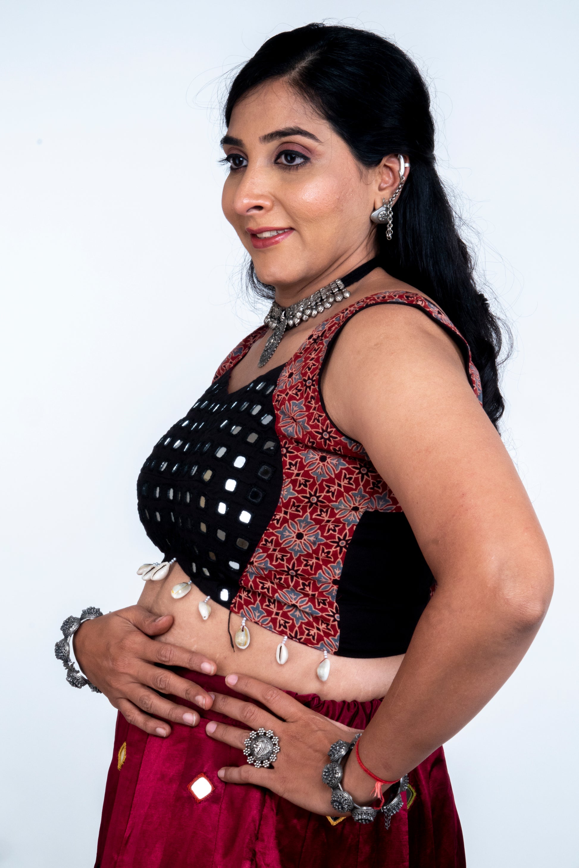 The Palash Blouse is a celebration of color, craft, and festivity. Handcrafted in soft cotton with intricate mirror work and delicate cowrie shell accents, this piece is designed to sparkle under the festive lights. Paired with Ajrakh hand block print, it brings together heritage artistry and modern style – perfect for dance nights, festive gatherings, and every occasion where you want to shine.