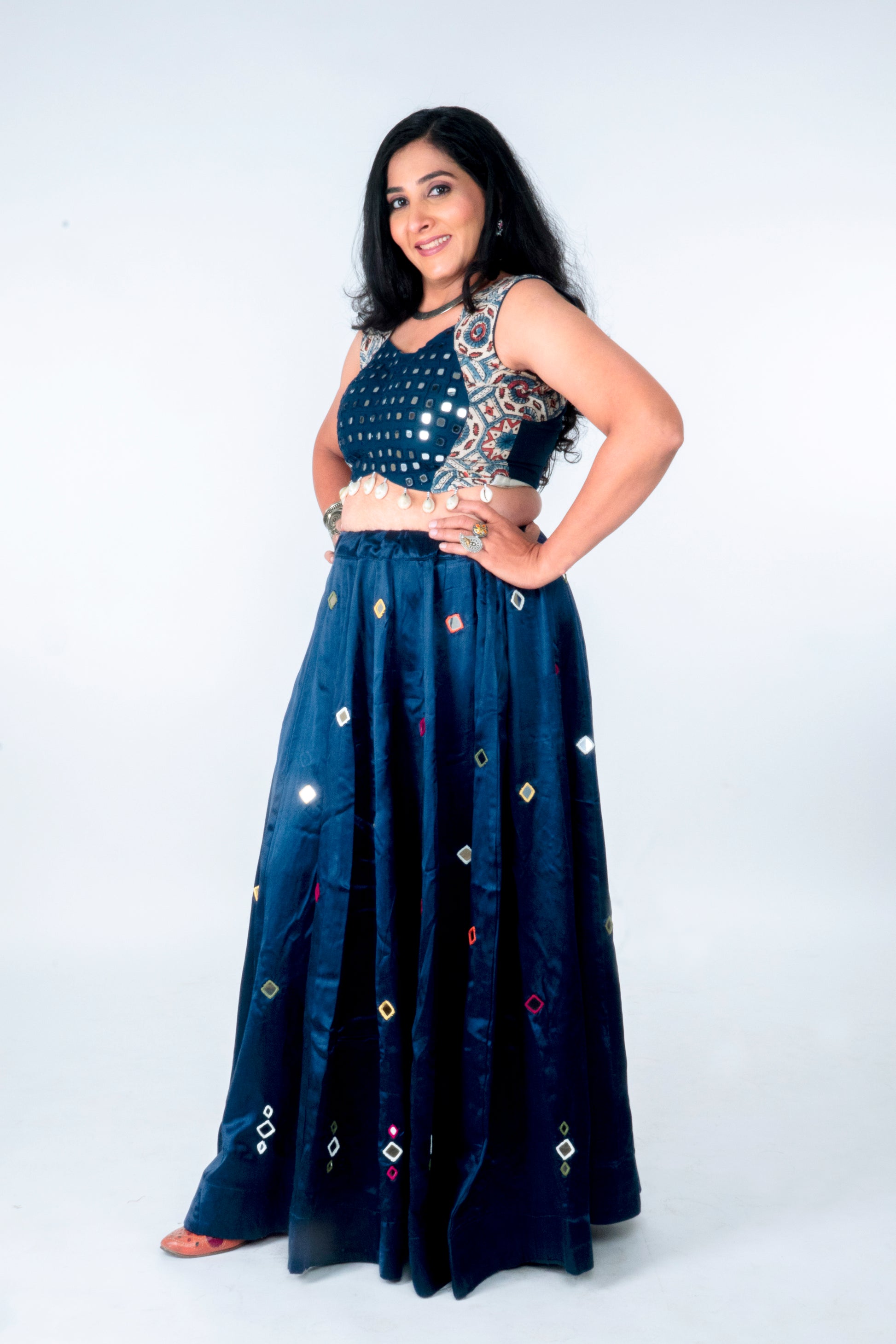 The Palash Blouse is a celebration of color, craft, and festivity. Handcrafted in soft cotton with intricate mirror work and delicate cowrie shell accents, this piece is designed to sparkle under the festive lights. Paired with Ajrakh hand block print, it brings together heritage artistry and modern style – perfect for dance nights, festive gatherings, and every occasion where you want to shine.